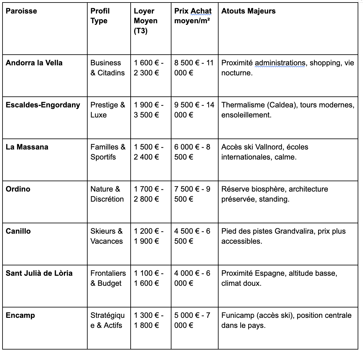 Sant Julià de Lòria : située à la frontière espagnole, c'est la paroisse la plus basse en altitude. Elle offre un microclimat plus méditerranéen et, surtout, des prix de location environ 15 % à 20 % moins chers que dans le centre. C'est le choix rationnel pour ceux qui font des allers-retours fréquents vers Barcelone ou La Seu d'Urgell.